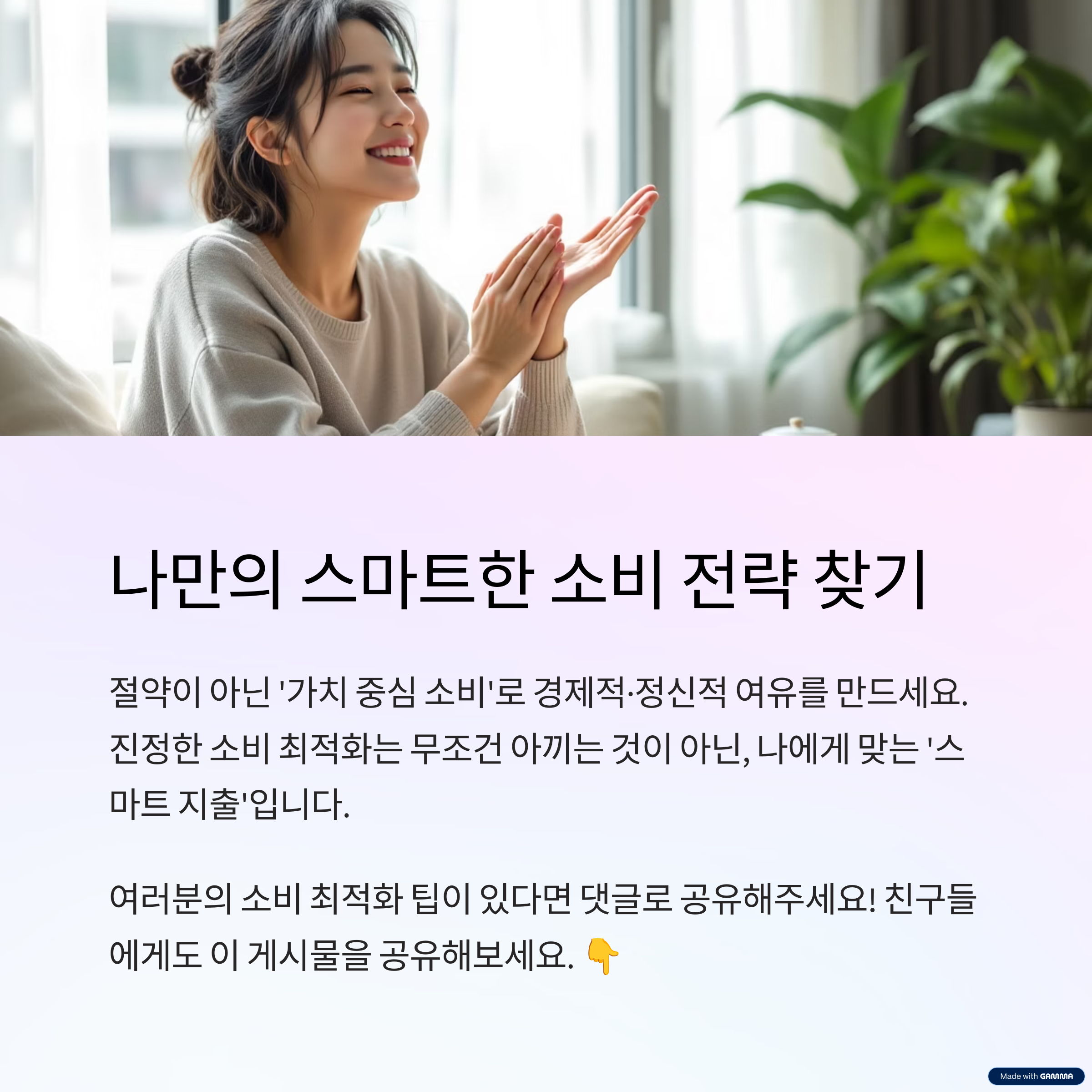 소비 최적화는 단순한 ‘아끼기’와는 다릅니다. 나에게 진짜 필요한 소비를 찾아내고, 불필요한 지출을 없애는 과정을 통해 만족감은 높이고 후회는 줄일 수 있습니다. 이런 전략은 장기적으로 삶의 질을 높이는 데 큰 도움이 됩니다.