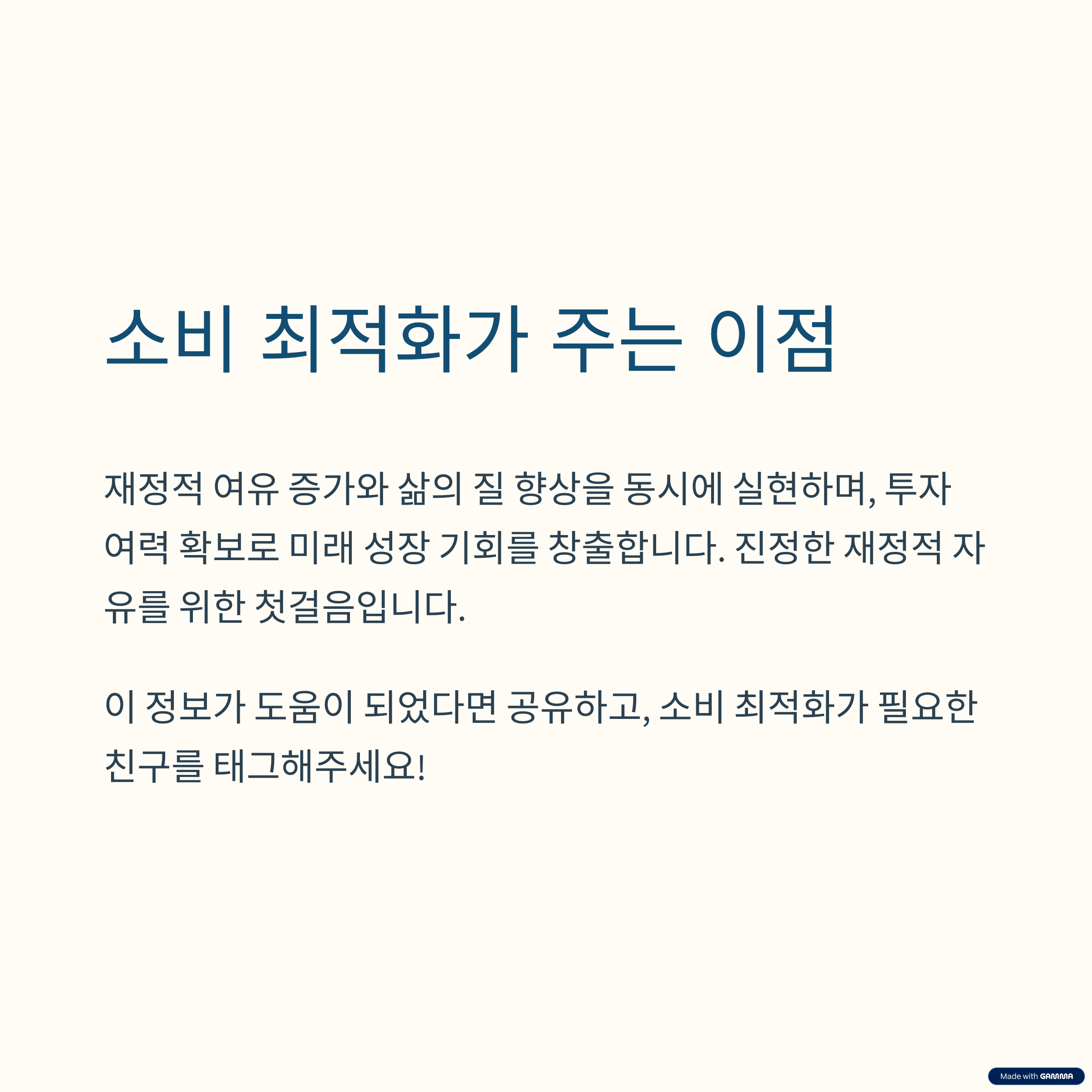 절약만으로는 원하는 재정적 자유를 얻기 어렵습니다. 이제는 소비 최적화를 통해 나의 삶에 꼭 필요한 곳에 돈을 쓰는 지혜가 필요하죠. 소득과 소비의 균형, 삶의 질 향상, 그리고 가치 있는 지출을 위해 오늘부터 소비 습관을 점검해 보세요. 여러분의 현명한 소비가 미래를 바꿉니다.
