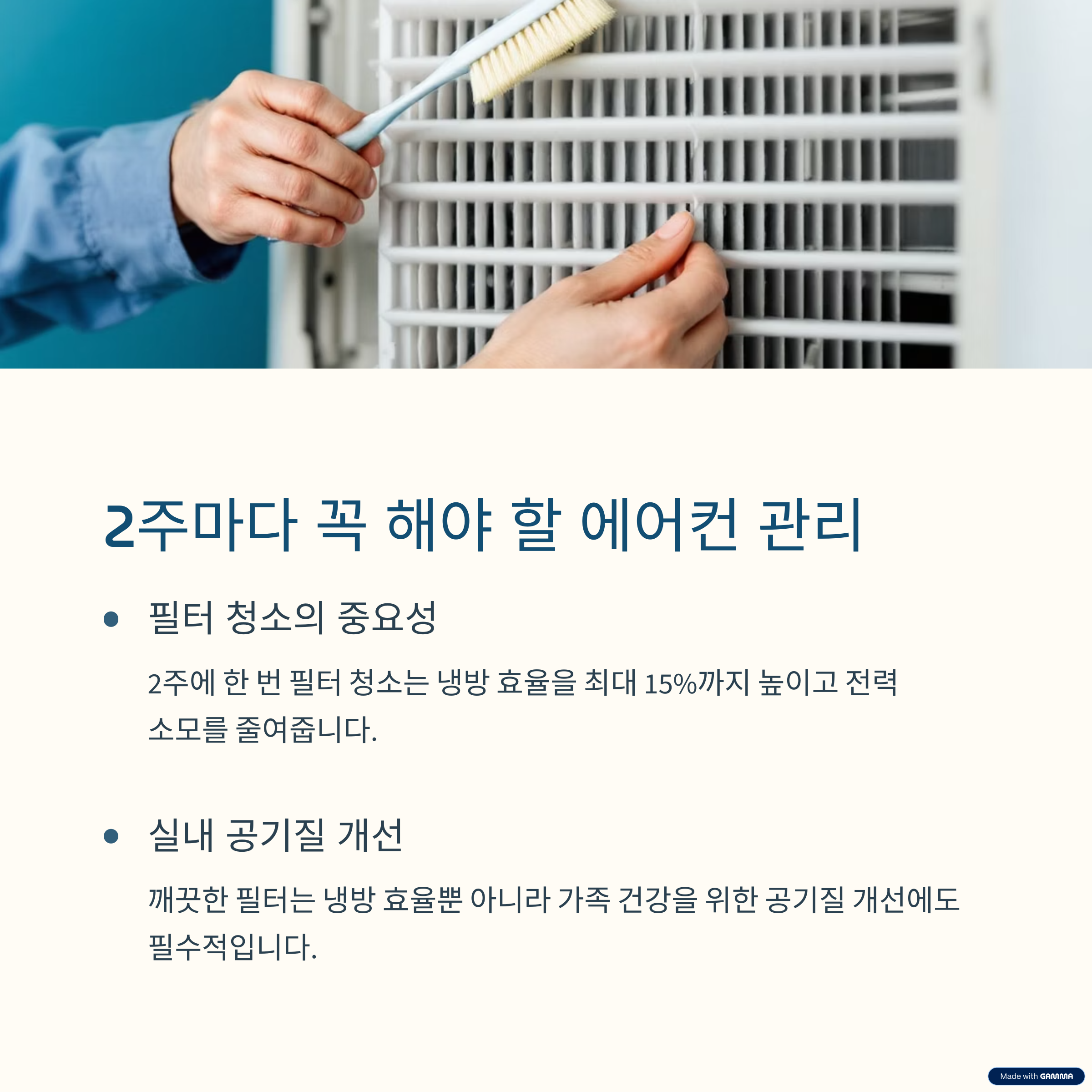 2주에 한 번씩 주기적으로 청소하여 냉방 효율을 유지하고 위생적으로 사용하는 것이 좋습니다.